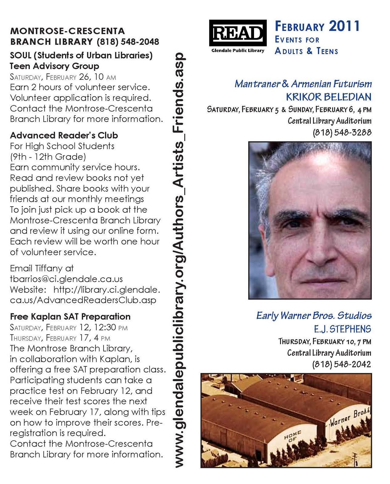 Plus Central Auditorium lectures by authors Krikor Beledian (Mantraner, Armenian Futurism) and E.J. Stephens (Early Warner Bros. Studios) in the continuing Authors, Artists, and Friends Series sponsored by the Friends of the Glendale Public Library!